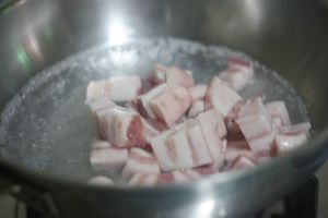 切块,厚度适中,五花肉冷水下锅,同时放姜片葱段,少许料酒。