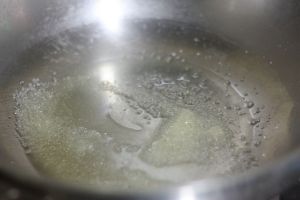 炒锅里放入1勺油和砂糖,用小火慢慢熔化砂糖。