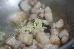锅中加油烧热后倒入五花肉煸炒至析出油分,表面金黄