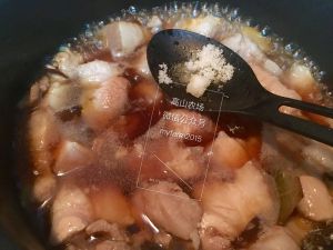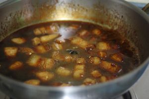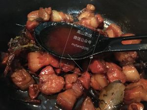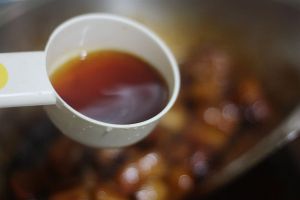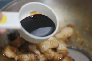 加入黄酒莫过猪肉,放入酱油、糖,不要放足量,收汁时需要再放少量上色