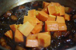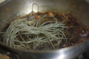 汤汁渐浓减少时,放入浸泡过的红烧粉条,翻炒均匀,盖上盖子焖5分钟。