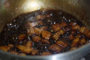 当肉块放在炒锅里,每一块肉黏上糖色。