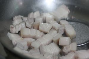 起锅不用加油,五花肉倒入锅中煸炒出油(如果锅底易粘,可加少许油)。