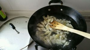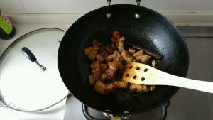 然后加入料酒 老抽 葱姜一起翻炒一会加水漫过肉 盖盖子炖