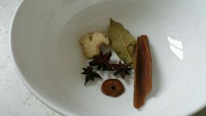 当冰糖融化变色出现气泡,将葱姜香叶桂皮甘草八角放入炒锅翻炒。