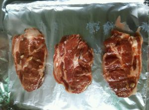 烤盘上放锡纸,把腌好的肉放上去,锡纸的四边最好往上折一下,以免汁水流到烤盘上不好清洗;