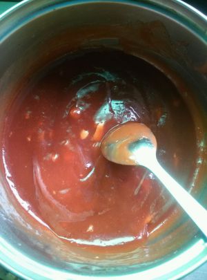 这个时候肉已经甘香饱满,肉汁紧锁里边软烂熟透了,放在一个不粘锅里,用一个细网漏勺把姜沫蒜沫滤除,只留下叉烧酱汁