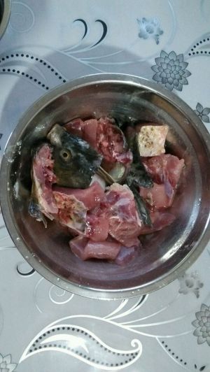 将鱼头鱼骨放油盐生粉腌制10分钟