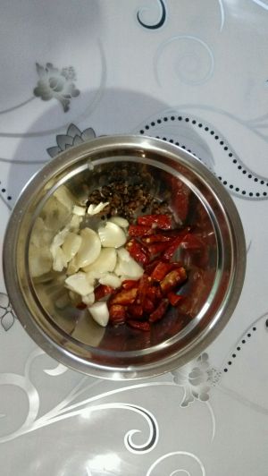 锅中放油把这些爆香,然后把花椒辣椒捞起待用,大蒜留锅内