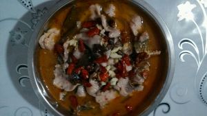 加水烧开后倒入鱼骨大火煮五分钟。然后把腌制好的鱼片放入锅内再煮三分钟,加鸡精起锅。