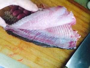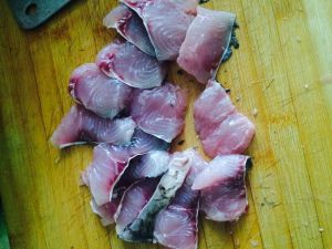 市场买回来已经杀好的鱼,洗净,去骨,斜刀切片,第一刀不要切断,第二刀才切断