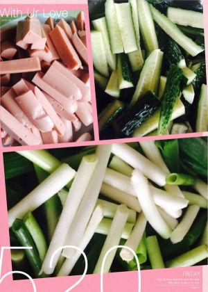 把鱼骨先放入锅里、在放黄瓜、大葱、火腿肠。