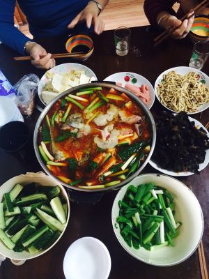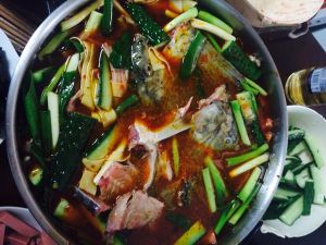 像涮火锅一样,可以放木耳、豆腐、青菜等!但我觉得还是鱼和黄瓜好吃!
