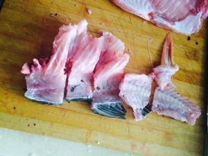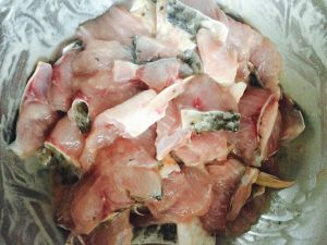 把鱼肉用鸡蛋清抓匀,放入盐、味精、料酒、淀粉、适量即可!鱼骨用用样的方法,腌制15分钟!