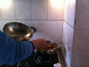 锅里放油(要多放一些,平时炒菜的三四倍吧)烧到8成热,关火。然后下入两勺花椒(大概60粒),下入去籽的辣椒段。由于这一步太过激烈导致我很害怕,所以没有拍到照片,从网上随便找了一个图。(这一步有一点危险,所以做的时候一定要注意安全)