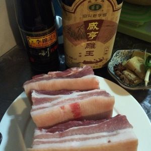 准备材料,五花肉, 花雕酒 ,秘制红烧汁,佐料等。