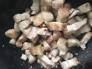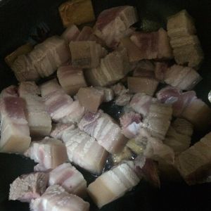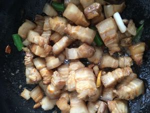 锅内倒入油,烧热后倒入五花肉,翻炒至表面金黄,油份炒出