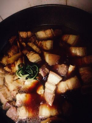 加入热水,冰糖与葱结,大火烧开几分钟后转小火焖煮八十分钟,收汁起锅。喜欢咸口的朋友可不加冰糖,喜欢吃辣的朋友可以再放几个干辣椒下去,依个人口味适当调整。