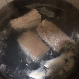 肉洗干净冷水下锅焯水,煮开后捞出。整块下去的肉更容易定型,切出来的样子好看。