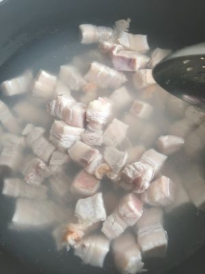 五花肉切成大小均匀的小块,用温水洗净,放入烧开水的锅中汆烫至变色,捞出沥干水份