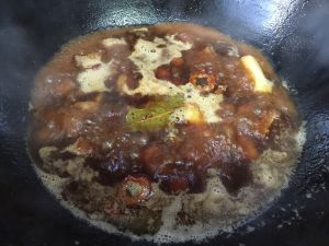 倒入啤酒,加生抽老抽各三瓶盖,糖三大勺,盐一小勺,一碗清水,葱结,煮开后换锅放入砂锅,没有砂锅可以不换锅