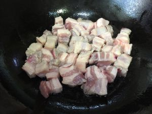 锅内少许油,中火,八成热,放入五花肉翻炒。