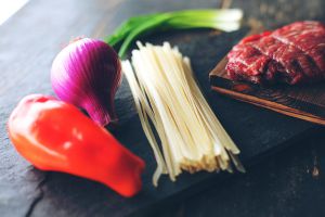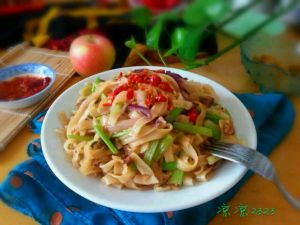 锅中下油,小火炒河粉,加入豆芽洋葱丝,青红椒丝一起翻炒加酱油,耗油,盐一起翻炒,加入炒好的牛肉和蛋皮丝,滴几滴香油出锅
