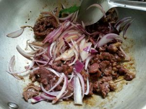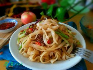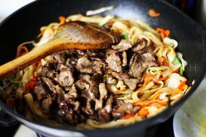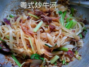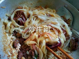 然后下河粉,牛肉翻炒,加料酒,生抽,糖调味,起锅前放入葱段
