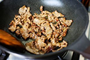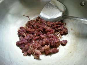 锅中下油爆香葱蒜,加腌好的牛肉翻炒,出锅备用