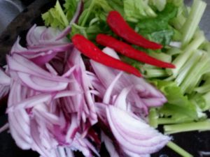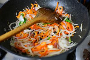 接着锅洗净后擦干水,烧热后倒入凉油,下葱姜丝、洋葱丝和红辣椒丝快速过油略炒;