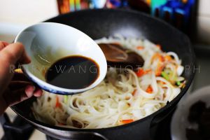 接着下米粉,要猛火炒,接着边翻炒边下适量生抽炒,左手用锅铲,右手用筷子辅助翻粉条,这样粉条充分入味。
