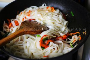 接着下河粉猛火快炒至河粉均匀的沾满底油;