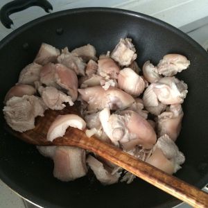 锅内加水放姜片和葱烧开,倒入猪手煮三到五分钟,捞出过凉水空干水分