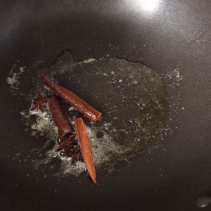 锅内放入油,烧至六成热放入桂皮、八角、白糖煸香