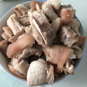 猪手买的时候让商贩把毛处理干净,我们这边是用火燎的,剁成块。回来洗干净凉水加料酒把猪手焯水。