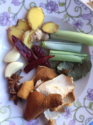 加葱段、姜片、一个八角、十几粒花椒、三片香叶,小火慢炖一个小时,猪手软糯就可以大火收汁装盘