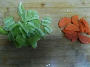 改中火倒入胡萝卜片和大辣椒片,翻炒断生。