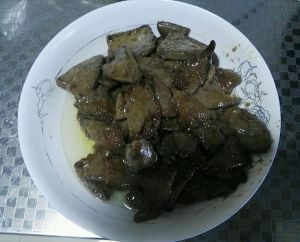 新鲜猪肝儿洗净、浸泡半天!最少两个小时放点白醋和盐!杀菌! 浸泡完捞出切薄片儿薄点比较好!三角形的!放料酒和淀粉和油抓匀腌半个小时!