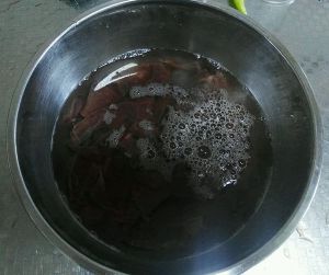 把猪肝片浸泡在水中,放入少许盐和醋浸泡三十分钟。