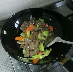 将配菜放里面爆炒然后放猪肝儿!放盐放糖、放醋!酱油出锅前放点蒜末、鸡精、蚝油!以及一点香油