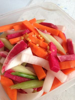 切几根同等大小的胡萝卜放进去一起腌制,到时候摆盘好看些。放入冰箱24小时后就可以吃了,两天后口味更佳