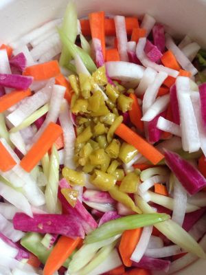 煞出的汁水倒掉,将各种蔬菜放到一个大容器里,放泡椒。不太吃辣的可不用切开。我呢本身吃不了太辣的,但是泡椒只剩半瓶了,菜有多就切开来了。真是辣啊~^_^~(上次只做了一根白萝卜,放了没切开的泡椒半瓶,微辣正好)其实泡椒的量就因人而异啦~