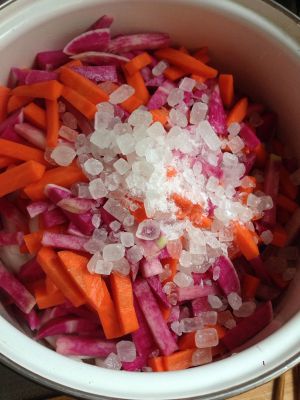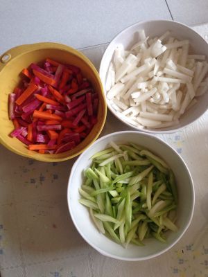 萝卜洗净,去皮(胡萝卜和白萝卜去薄皮,心里美得去厚皮),老公喜欢吃芹菜就放了一大棵芹菜(去掉叶子,斜切,还有哦芹菜叶做汤很不错哦~)分开放,放大量的盐,放置半小时以上,至煞出水分