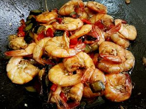 锅中倒入油,大火加热,待油5成热时,放入干红辣椒和花椒,改成小火,煸出麻辣味后,将火改成大火,放入大葱煎约20秒钟后,放入鲜虾翻炒。