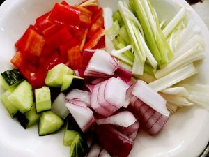 虾变色后,加入黄瓜,红椒,生抽焖煮5分钟