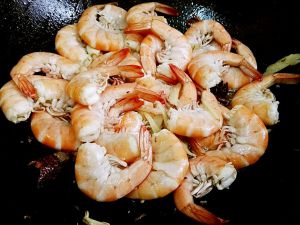 烧热油后,倒入腌制好的虾,翻炒至红色