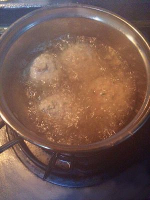 锅内放油,将肉团成小拳头那么大,下锅炸至外表金黄后捞出备用。