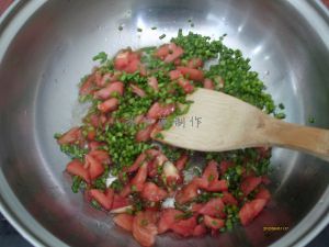 锅里放少许的的色拉油,滑入番茄丁翻炒一下。