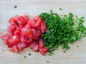 番茄去皮切好,鸡蛋碗里拌均,葱花切好