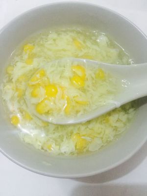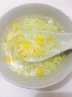 玉米熟了,勾点湿淀粉,倒入锅里,接着打两个鸡蛋,鸡蛋倒进锅里的时候要用筷子画圈的搅拌,这样出的鸡蛋花很薄,轻飘飘的感觉。